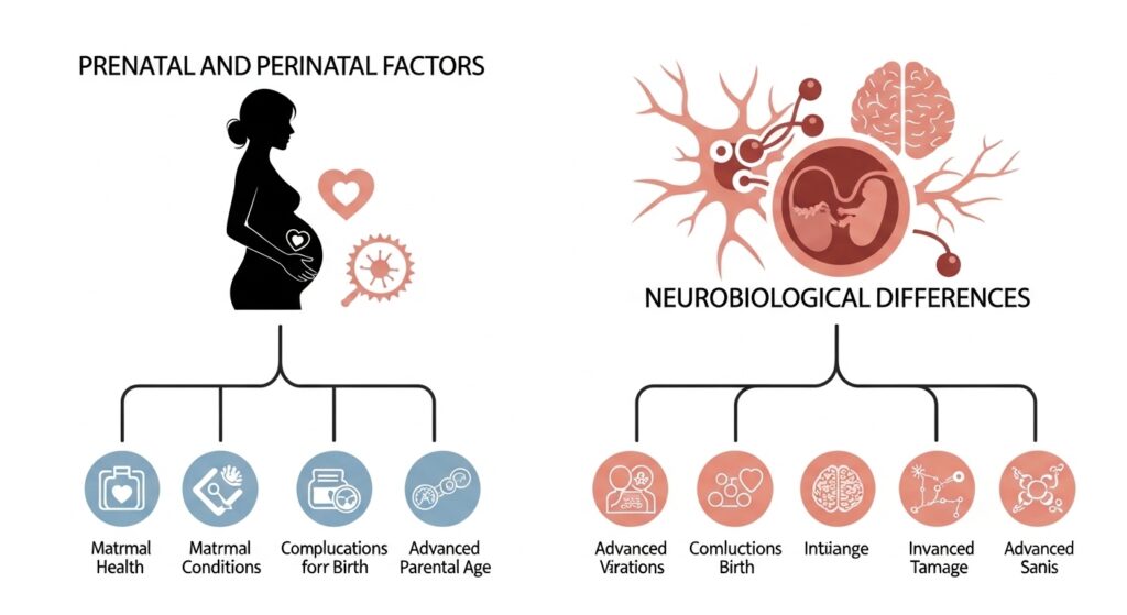 출생 전후(주산기)의 여러 요인들도 자폐 위험 증가와 연관성이 보고되어 있습니다.