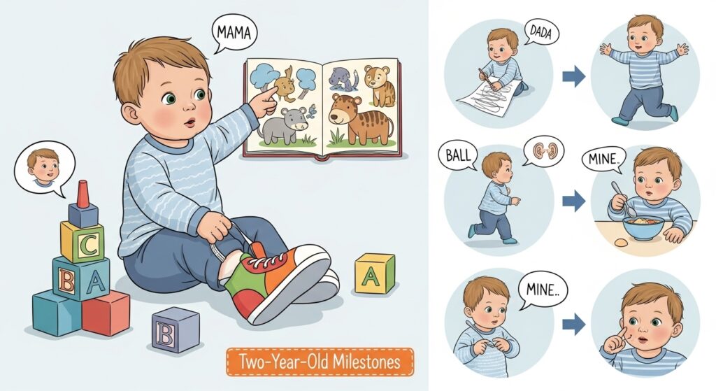 이제 아이는 뛰어다니고, 계단을 오르내리고, 끊임없이 말을 배워가요. 단어 하나씩 말하던 아이가 “엄마 줘”, “아빠 가” 처럼 두 단어를 붙여서 말하기 시작하는 건 이 시기의 가장 큰 언어 발달 이정표예요.